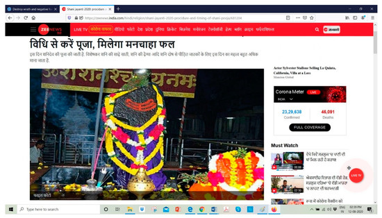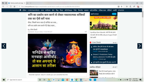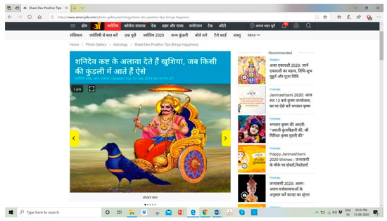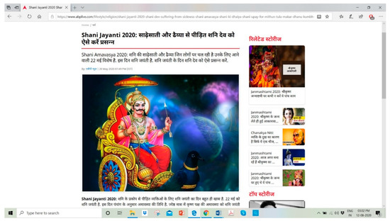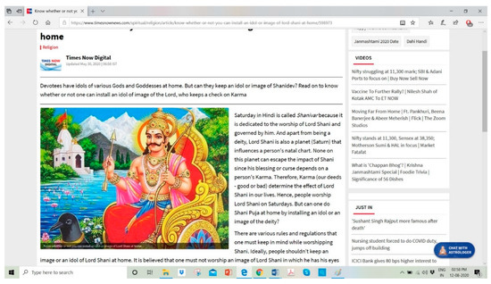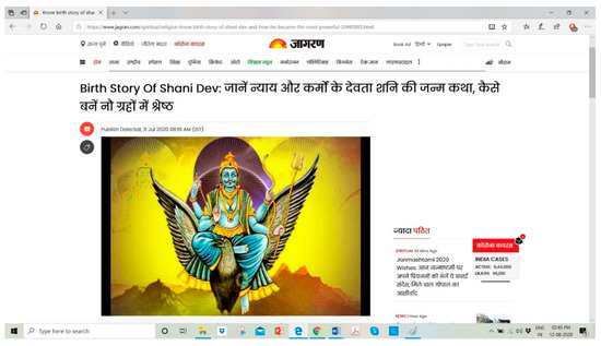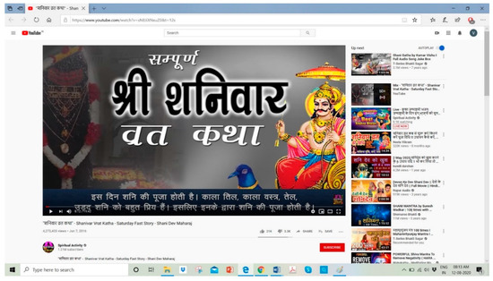 Digital religious content often facilitates intermedial conversations that lead to important kinds of media convergences. These convergences fundamentally define contemporary religious publics in India that simultaneously circulate over multiple digital platforms while having access to other mediated forms of the same content. What existed in an older media form (i.e., print and analog) passes into new (digital) media, now armed with new affordances. For instance, a popular YouTube channel, Spiritual Activity, dealing with Hindu rites and rituals with 1.2 million subscribers carries a video narrating Shani’s vrat katha (Figure 8).5 Similarly, the religion, culture, and lifestyle supplements of regional language and English newspapers also carry articles on Shani’s legends on certain days associated with this deity. Such content may be in addition to chapbooks and ritual manuals, calendar art images, and other such ephemera that Shani-afflicted Hindus may have in their homes. To wit, on 1 August 2020, Navbharat Times, Patrika, and Jagaran—some of the most popular Hindi dailies in India—all carried Shani’s vrat katha.6 This date was particularly significant for Shani worshippers. It marked the thirteenth day of the month of shravan in the lunar calendar when observances and austerities are customarily undertaken in the honor of Shiva to mitigate accumulated sins (pradosh vrat). However, on this occasion, the date happened to fall on a Saturday—the day of Shani. The day, thus, turned into Shani trayodashi, when, according to legend, Shiva himself fasted to propitiate Shani. In recognition of this compounded ritual significance, the day’s newspapers urged readers to additionally read Shani’s vrat katha if they were keeping the pradosh vrat.