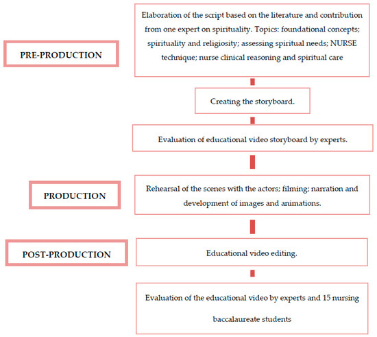 The pre-production phase consisted of three stages: elaboration of the script, elaboration of the storyboard, and evaluation by experts (Fleming et al. 2009). The script was described based on the results from a literature review, through a search in electronic databases (SCIELO, LILACS, MEDLINE). The following search terms were used combined with the Boolean operators AND and OR: teaching, nursing, spirituality, religiosity, concept, and video/multimedia. After, the script was reviewed by two international experts, one of whom is proficient in Portuguese.