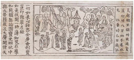 Despite the circulation of the Karaṇḍamudrā Sūtra in the Sinitic Buddhist sphere during the Tang dynasty, the tremendous popularity and wide reach of the text after the tenth century are hard to separate from the state-sponsored printing under the royal patronage of Wuyue, an independent kingdom that prospered in the southeast coastal region of China amid the political turbulence of the Five Dynasties and Ten Kingdoms period. Hangzhou, the kingdom’s capital, became a cultural center where Buddhist monks gathered and Buddhist monuments were constantly being built under royal patronage. The metropolis was closely connected to neighboring kingdoms in Korea and Japan through its main port, Mingzhou 明州 (present-day Ningbo 寧波). Royal patronage of Buddhism culminated during the reign of Wuyue’s last monarch, Qian Chu 錢俶 (r. 948–978; also known as Qian Hongchu 錢弘俶). Zhipan’s 志磐 (ca. 1220–1275) Complete Chronicle of the Buddha and Patriarchs (Fozu tongji 佛祖統紀, comp. 1269) relates that Qian Chu had produced 84,000 stūpas out of gilt-bronze and iron in admiration of the deeds of King Aśoka and had each enshrine a copy of the Karaṇḍamudrā Sūtra. Stūpas containing sutras were distributed throughout his kingdom.61 This account calls to mind the famous legend of King Aśoka, who is said to have opened seven of the eight stūpas holding relics of the Buddha, distributed those relics, and built 84,000 new stūpas across his kingdom (Strong 2004, pp. 136–44).