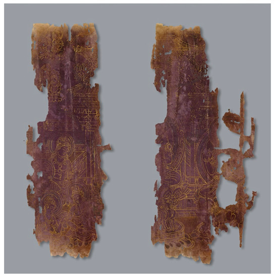 Frontispiece to the Flower Garland Sūtra. Ca. 754–755 CE, Silla (57 BCE–935). Gold and silver pigment on red mulberry paper. H. 25.7 cm; L. 10.9 cm; H. 24.0 cm; L. 9.3 cm. Leeum, Samsung Museum of Art.