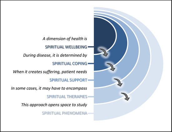 The expressions spiritual wellbeing, spiritual coping, spiritual support, spiritual therapies, and spiritual phenomena are explored below. These expressions are listed in this order because they are progressive in nature, as illustrated in Figure 1. Spiritual wellbeing is related to health and quality of life, an association well accepted by health sciences. During a disease, this wellbeing is partially determined by spiritual coping, the use of spiritual resources to face the adversity. If the coping style of a patient creates spiritual struggle (tensions, conflicts, and concerns about transcendental matters), spiritual support may serve to modulate this suffering. Such support must encompass the entire belief system of the patient, which, in some cases, encompasses some form of spiritual therapy. This approach paves the way for the study about clinical impacts of anomalous spiritual experiences.