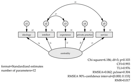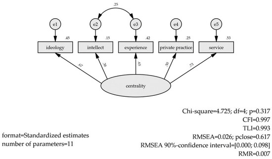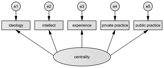 Models are computed with raw data and the bootstrap procedure is applied in the CFA with a to obtain 90% bootstrap corrected confidence intervals for the parameter estimates. The confidence intervals are reported along with the point estimates throughout the result and discussion sections, where possible. The following designation with Greek letters is used in the result and discussion section: —factor loading, —with one-digit subscript for the variance of a residual and with two digits subscript for the covariance of residuals. Any statistical parameter linked to ideology receives an , intellect , experience , private practice , and public practice subscripts. For example, the correlation of the residuals of ideology and public practice will appear as in the text sections.