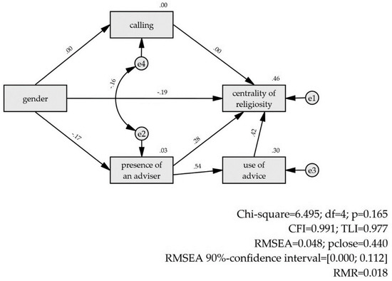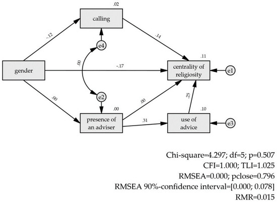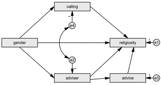 The path analyses are split in two. Identical models are run with the Orthodox and Pentecostal subsamples. The models comprise 5 manifest variables: gender, calling, presence of a religious adviser, advice, and the target variable of religiosity, which is the CRSi-7 score, because of its more general-purpose compared to the CRS-5 and a slightly better model fit in the CFA. Gender is the only exogenous variable, with both direct and indirect paths to religiosity. The indirect channels are mediated by calling on the one hand, and religious adviser with advice on the other one. The residuals of calling and the presence of a religious adviser are allowed to correlate in the model after an iterative model modification process. The final model is shown in Figure 2.