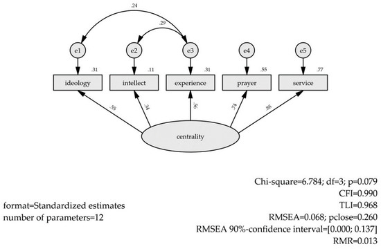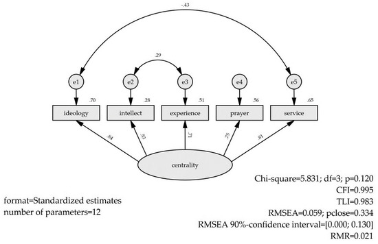 As the short forms both result in 5 manifest indicators with one per core dimension (ideology, intellect, experience, private, and public practice) and one latent variable of Centrality of Religiosity, the postulated models for the CRS-5 and CRSi-7 are built around the centrality, as a latent variable with 5 reflective indicators with uncorrelated residuals (see Figure 1 for a schematic depiction). The models are identified with the factor weight of public practice restricted to equal 1. Starting with a model with uncorrelated residual modification indices greater than per degree of freedom (which is round up to 4.00 for practical reasons) leads to an iterative model modification. Model modification is repeated until the global fit indices are met. The final models of the CRS-5 and CRSi-7 with the Orthodox and Pentecostal subsamples should comply with the recommendations by Hu and Bentler (1999). Thus, the CFI (Comparative Fit Index), the TLI (Tucker-Lewis Index), the RMSEA (Root Mean Square Error of Approximation), the SRMR (Standardized Root Mean Residual) are examined to meet the following values: , , with a 90% confidence interval of and a non-significant closeness of fit test statistics (). The SRMR should be less than or equal to 0.08 (). Absolute, relative, and parsimony-related indices are combined to achieve a comprehensive, conservative, and reliable evaluation of the calculated statistical models.
