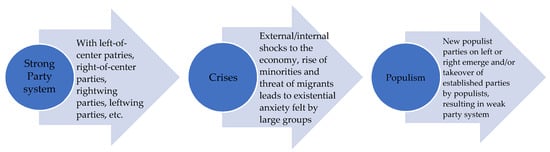 The distinction between populist leaders and populist political parties is critical. Generally, populism is associated with larger-than-life leaders, such as Trump, Erdogan, Bolsonaro, Duterte, etc. However, it is possible that whole political parties are populist while their leaders are not, or vice versa. Populist leaders and populist parties both rise when the political system is in crisis. It can be in a long-term crisis extending numerous decades, with no history of ever known long-term stability, or it can be a crisis of an established political system. Since the 1950s, many populist leaders in Africa and Latin America rose after decades of instability or after the end of colonial rule. Gamal Abdel Nasser of Egypt and Juan Peron of Argentina are examples of such populist leadership. More recently, populism is associated with the crisis of well-established political and party systems in consolidated democracies (see the Figure 1). There is a rejection of once favored political parties and constitutional arrangements. It is the loss of legitimacy of the existing political parties, not only of political leaders, that has also resulted in the rise in populists (Roberts 2017).