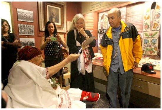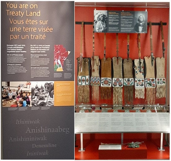 James Clifford suggests that a museum, in welcoming a mission of “contact work” such as this, and submitting to the relational obligations of its collection and its Indigenous community, could become a museum “decentered and traversed by cultural and political negotiations that are out of any imagined community’s control—[a] museum that begin[s] to grapple with the real difficulty of dialogue, alliance, inequality and translations” (Clifford 1997, p. 213; Matthews 2016, p. 242). In welcoming the pipes in their role as teachers, the Manitoba Museum has made tentative steps in this direction. The new treaty exhibits provide a radical departure from the patronizing arrogance of the cultural Darwinist paradigm. The presence of the pipes firmly places interpretive authority outside the museum among contemporary Indigenous ceremonial experts. Their participation in the treaty exhibit has made the museum an institution dependent upon multiple Elders including Doreen Roulette for the selection of the pipes, the Elders Council of the Treaty Relations Commission for the authority to organize the exhibit, and the Elders at Roseau River for the ceremonial expertise to make the exhibit possible. Through their work, the pipes have created the possibility that the museum will become a thoughtful partner in the type of respectful long-term relationship with First Nations people which the makers of the treaties envisaged.