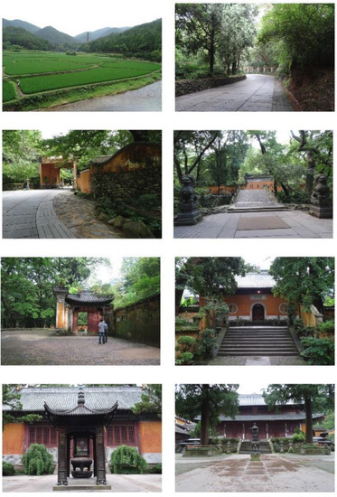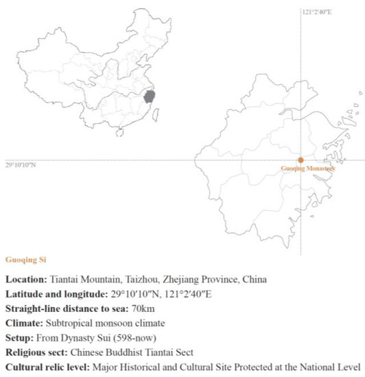 Guoqing Si is situated in Mount Tiantai, in Taizhou, Zhejiang Province (Figure 3). It was originally built in 598 during the Sui Dynasty and has witnessed more than 1400 years of history. It is the cradle of the Tiantai Buddhist sect, considered the first to evolve after the spread of Buddhism to China. The monastery is located in the valley among five peaks and is surrounded by two creeks (Zhang 1717) (Figure 4).