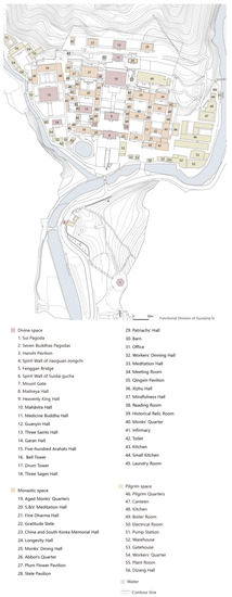 With a history of continuous expansion, destruction, restoration, and development of Guoqing Si (Guanding n.d.), it is clear that seven key construction works played large roles in the expansion and eventual spatial arrangement of the monastery (Figure 15). Initially, in the year 598 of the Sui Dynasty, the Main Hall was constructed at the center of the monastery. However, it was constructed during the humid season and building materials such as bamboo and wood were not used correctly (Guanding n.d.), meaning that in 605, four years after it was established, the buildings began to tilt and suffer from water leakage. It therefore required restoration works. The monastery later suffered during the great Anti-Buddhist Persecution (840–846), and during the late Tang Dynasty in the year 851, Emperor Xuanzong of Tang (685–762) ordered that Guoqing Si should be reconstructed. The Main Hall was to be rebuilt first, then the monks’ dormitories(佛殿初营,僧房未置。) (Shen 861). In 1005, Emperor Zhenzong of the Song Dynasty (1010–1063) bestowed a ton of gold to further restore and refurbish the monastery, and the Buddha statues were gilt (次参大佛殿,丈六金色释迦像,左右坐丈六弥陀、弥勒像,烧香礼拜。) (Shi n.d.). It was further renovated after Master Tan E (1285–1373) was reinstated by Emperor Taizu of Ming (1328–1398) to be the Abad of Guoqing Si in 1369 (Ding 1995). In 1733 in the early-mid Qing Dynasty, Emperor Shizong of Qing (1678–1735) issued an Imperial edict to reconstruct it once again, which reshaped the image of the monastery, and resulted in the basic layout of the current Guoqing Si (Ding 1995).