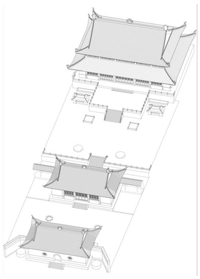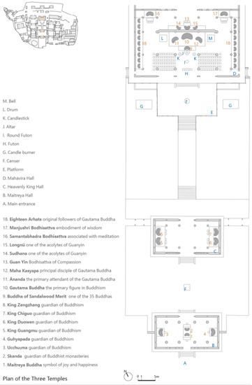 The configuration of the central axis of Buddhist monasteries has gone from being centered on the pagoda to being centered on the main hall (Liu 2007). The main hall, where the central altar of the Buddhist image is located, is regarded as the most important sacred space (Sun 2017) and the climax of the whole layout, no matter the spiritual level or the architectural level (Prip-Møller 1937). In order to make the comparative research more scientific, this article regards the entrance to the main altar in the central axis space as a complete worship space based on the religious and spatial relationship between deities, monks, and pilgrims.