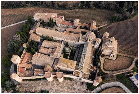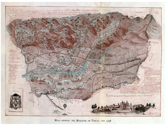 Poblet Monastery was built in 1151, and may be seen as the prototype for the Spanish Cistercian Monastery. It developed from French origin, where one can find its motherhouse, Fontfroide Monastery. Poblet Monastery is situated in the city of Vimbodí, Tarragona Province, at the foot of Mount Prade (Figure 7). It is surrounded by mountains on the east, south, and north, though the west side is open (Figure 8). Also, on the east side runs the Francolí River, which provides an abundance of high-quality water flowing from the nearby mountains. The monastery was constructed on the same land upon which the Roman house, la Granja Mitjana, previously stood (Altisent 1974).