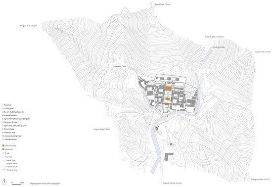 Since Chinese scholars first began to investigate Buddhist architectures in China (Liang 1961), the central axis has always been considered as a key issue. From its evolution and formation (Wang and Xu 2011), speculation on the basic spatial sequence (Su 2009), space configuration (Wang and Lu 2000), and its role in the development of the whole monastic layout (Wang 2016), it has emerged as a fundamental unit in Buddhist monasteries. Therefore, it has always received great attention through records (Liang 1932), drawing (Liang and Fairbank 1984; Zhang 2012), and mapping (Wang 2011).