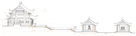 Guoqing Si covers an area of 17,501 square meters, with 22 main halls distributed in five axes. These can be separated into three main functions: divine space, monastic space, and pilgrim space (Figure 5). There are more than 60 buildings along these axes, which also perform the auxiliary function of helping to enclose the courtyard. The functional division of the monastery can be understood as the following: the western part is mainly for Buddhist rituals, sutra study, and monks’ day-to-day lives. The eastern part is mainly made of the supporting facilities for daily life at the monastery, as well as the residences of the abbot, monks, and pilgrims. From the south to the north, the buildings on the central axis are dedicated to the worship of Buddha. This includes the Three Temples. It is important to note that the use of three here is a generic term; the number may vary in different Buddhist monasteries. In Guoqing Si, the Three Temples refers to the main entrance towards the altar, comprised of the Maitreya Hall, the Heavenly King Hall, and the Mahāvīra Hall. The courtyard is called Mingtang (Bright temple), and it is an extension of the main hall space. The role of the courtyard is also reflected in its use in specific Buddhist rituals. For the purposes of comparing the sacred space of Guoqing Si to the Cistercian Church, three halls and two courtyards are considered as a whole volume (Figure 6), which is around 100 m long and around 30 m wide.