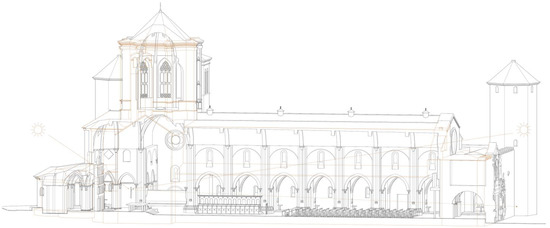 A similar history can be seen at the Poblet Monastery (Figure 16). The Church was largely built in two phases (Bassegoda Nonell 1983): the initial phase between 1151 and 1165 driven by the Count of Barcelona, Ramón Berenguer IV (1114–1162), and then again from 1165 through to the 12th century with the support of the King of Aragón and the Count of Barcelona, Alfonso II. This was analyzed in detail by José Luis Bozal González according to the marks left by stonecutters on the surface of the Church (Bozal González 2016). The Church can be divided into 4 parts: head, body, façade, and tower. The tower, situated on the top of the crossing of the central nave, was originally used as a bell tower. It was constructed in 1330 and was used in this way until the south tower of the Church was constructed in 1660, taking over as a bell tower. The form of the central nave was based on that of its motherhouse, the Church of Fontfroide Abbey, but it also took inspiration from the Abbey of Cluny, the grandest, most prestigious, and most well-endowed monastic institution in Europe, which had great influence on Europe from the second half of the 10th century through the early 12th. Alongside this, the Church of Poblet was also influenced by the Abbey of Saint-Denis, the prototype of gothic architecture.