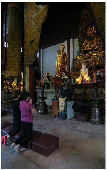 Pilgrims generally occupy the outermost position closest to the entrance. In the Three Temples, pilgrims normally stand in the courtyard (Mingtang) while in the Church, they sit in the atrium. When speaking about the role of pilgrims, it is worth noting that both monasteries are constructed by monks with the help of donation from pilgrims. With this in mind, some pilgrims hope that monks can sing a daily Mass for their soul (Altisent 1974), since they are the earthly representatives of their respective deities. In the mind of a pilgrim, making an offering to the monks and listening to their teachings is equivalent to making an offering to the deities themselves.