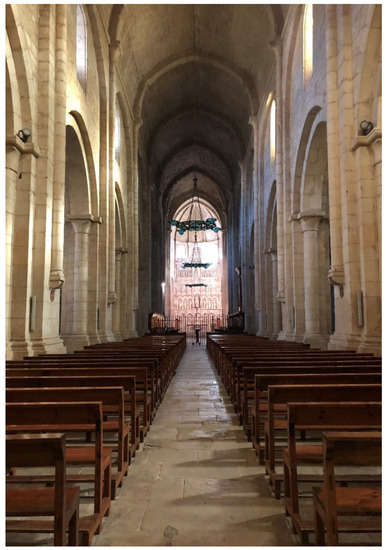 It was completed in 1144 under the direction of the Abbot Sugar, then the Abbot Copons decided to reform the south-side aisle, raising the height of the roof and adding seven chapels. After a fire in 1575 and an earthquake in 1792, four buttresses were added to the south of the Church to support the wall of the central nave. However, the imbalance (Portal Liaño and González Moreno-Navarro 2013) of the structure caused by this reconstruction lead to cracks on the inner surface of the building, which has required a large amount of restoration in the past decade. All in all, the Church was the first aspect built in the Cloister (Bango Torviso et al. 1998). It also took the longest construction time, and has undergone many transformations and restorations since its initial development.