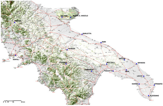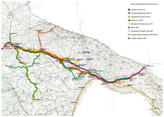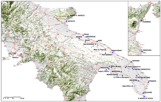 In southern Italy, and Puglia in particular, the itinerary partially follows the consular road known as the Via Traiana (Dalena 2014), which, in its coastal and inland variants, “was not identified with the Appian-Trajan consular road alone, but also with the Adriatic coastal highway (from Sipontum to Barium) and the inland transhumant herding routes (‘or white roads’)” (Copeta and Marzulli 2012, p. 238). From Egnatia, the route turned south towards Brindisi (Via Traiana) and from there descended to Otranto (Via Traiana “Calabra”), branching out into various “circuits” throughout Salento and often intersecting with other ancient devotional routes.