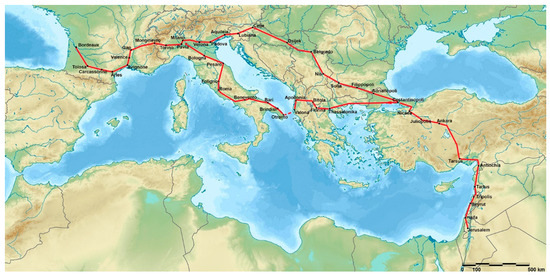 From his home town, he and a group of pilgrims walked the Via Domitia from Toulouse to Arles, crossed the Alps at Mont Cenis, travelled through northern Italy from Turin to Aquileia, entered the Danube valley and turned south along the Via Diagonalis, which ran diagonally across the Balkan Peninsula. After passing through some inland towns in Slovenia, Hungary, Croatia, Serbia, Bulgaria and present-day Turkey, he reached Constantinople, crossed the Bosporus and continued overland along the inland stretches of the Roman road system, passing through Anatolia and Syria and finally reaching Palestine. On his return journey, the Anonymous palmer travelled with his companions back along the same Middle Eastern roads as on his outward journey, but once he had reached Constantinople, he took the Via Egnatia through Thrace, Macedonia and Epirus to Vlora, where he embarked and crossed the Strait of Otranto, landing in the City of Martyrs. He then travelled up the Salento peninsula along the Via Traiana Calabra, stopping at Brindisi and Bari, thereafter following the Via Appia to Benevento and finally Rome. Other members of the group continued along the Via Flaminia to Rimini and finally along the Via Emilia to Milan, where the “Itinerarium” ends (Figure 5).