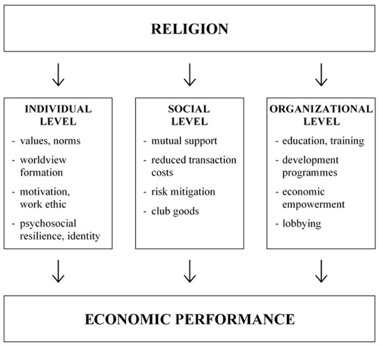 Transmission mechanisms from religion to economic outcomes. Note—Author’s elaboration based on Haynes (2009) and Öhlmann et al. (2016). While the separation of the three dimensions is a useful analytical tool, it should be noted that the three dimensions are intertwined in practice and in the self-understanding of most religious communities.