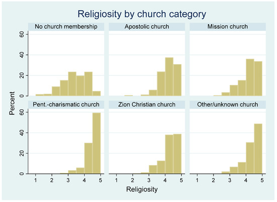 The mean value of the variable CRS in the dataset is just above 4 (Table 1, Panel II). On average, people in the survey area are highly religious. This corresponds to similar findings from Centrality of Religiosity Scale data from Nigeria (Hock 2009). Table 2 depicts mean religiosity across the different religious communities. Church members are more religious than non-members. The figures confirm findings from sociology of religion indicating that Pentecostal–Charismatic churches foster a particularly high degree of individual religiosity. The hypothesis that members of African Independent and Pentecostal–Charismatic churches are more religious in general does not hold. While mean values of religiosity are higher in the Pentecostal–Charismatic churches and the Zion Christian churches, the difference between Apostolic churches and mission-initiated churches is not statistically significant. Figure 2 shows the distribution of religiosity for the different categories. The distribution for members of Pentecostal–Charismatic churches has the largest skewness toward the highly religious.