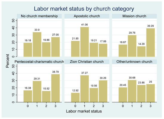 Labor market status by church membership. Note—Figure shows the distribution of labor market status according to church category. Labor market status 0 indicates not working and not actively looking for work, 1 indicates not working but actively looking for work, 2 indicates employment or self-employment in the informal sector, 3 indicates formal sector employment or self-employment.