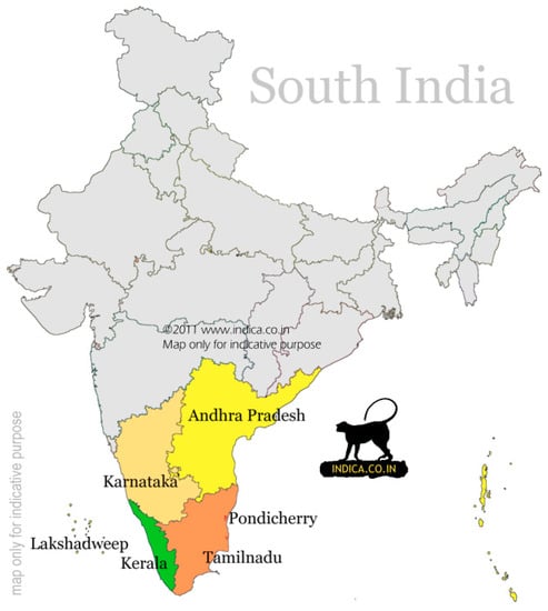 Map of India. The south Indian states are Andhra Pradesh, Tamil Nadu, Karnataka and Kerala. (https://visimaps.blogspot.com/2016/04/south-india-map.html, accessed on 13 February 2021).