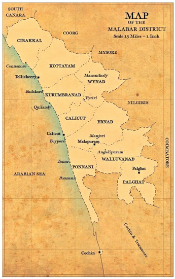 Source: Created by referring to the Gazetteer and other records. Geographical extent of the Malabar District, Kerala with its revenue divisional head-quarters and Taluks. Cirakkal, Kottayam, Wayanad, Kurumbranad, Calicut, Ernad, Ponnani, Walluvanad, and Palghat together form the Malabar. (https://upload.wikimedia.org/wikipedia/commons/f/fb/Malabar_District_Map.jpg, accessed on 20 January 2021).