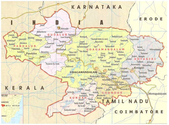 Source: Geographical position of the Nilgiris bounded by the states of Karnataka, Tamil Nadu, and Kerala (https://badaga.files.wordpress.com/2018/04/nilgiris.jpg, accessed on 13 February 2021).