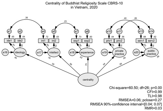 Results of the confirmatory factor analysis with the Centrality of Buddhist Religiosity Scheme 10. items. For an explanation of the item abbreviations please consider Table 1. The second level factor of “centrality” represents the psychological concept of the centrality of religiosity. The first level factors represent each the concept of a core dimension of religiosity.