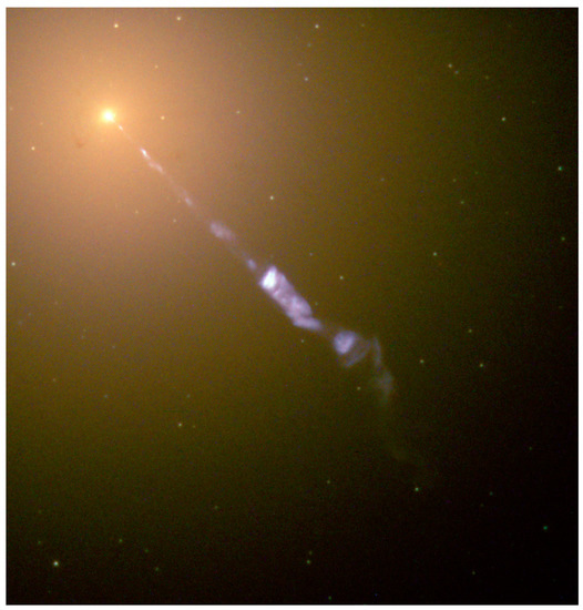 - Neronov, Andrii, and Felix A. Aharonian. 2007. Production of TeV Gamma Radiation in the Vicinity of the Supermassive Black Hole in the Giant Radio Galaxy M87. Astrophysical Journal 671: 85–96. [Google Scholar] [CrossRef]