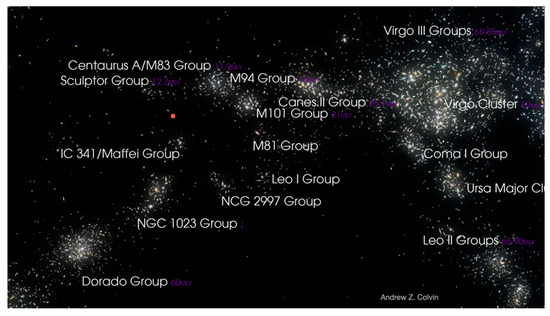 Galaxy clusters and groups comprising the Laniakea supercluster. The small red dot slightly above and left of center shows the position of the Local Group of galaxies of which the Milky Way galaxy is a member. Image credit: Andrew Z. Colvin, Creative Commons Attribution.