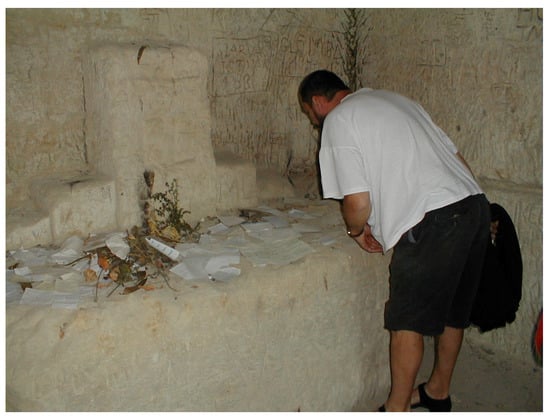 The practice of writing prayers arising in the course of the last decades of the 20th century not only among the cult of transcendent beings canonised by the different denominations. In the 1980s and 1990s a form of pilgrimage arose around the graves or monuments of stars from popular culture or public figures. Their places of remembrance became sacred places charged with performative power where the visitor could join in a more-or-less independent cult not attached to any further interpreting system—the cult of a star who had become an icon. Here, they could receive spiritual inspirations that could become sources of metaphysical experiences pointing beyond everyday life. Many people began to visit these places in the hope of such experiences, turning to the icon in whom they had invested special power (Margry 2010, pp. 138–39). In this way, the deaths of Jim Morrison, Steve Prefontaine, and Princess Diana—and also their memorial sites—became cult places where transformed elements of the offering and devotional customs of traditional places of pilgrimage also appeared (flowers, candles, leaving commemorative and gift objects, special rites). Among these, in all cases, were hand-written supplications to the star, addressed as a saint, or requesting their intercession (Bowman 2001; Gennet and Rowbottom 2009; Wojcik 2008; Margry 2010).