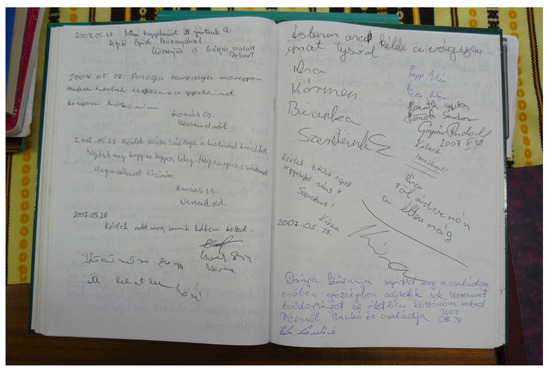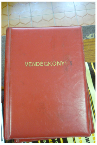 The circumstances that led to the procurement and placing of such a book can also provide important information for a more precise definition of the books examined. In many cases, the different name given to these books is an unequivocal reference to this context. In Hungary they are called Vendégkönyv (Guestbook), Emlékkönyv (Remembrance Book). In Germany and Austria, the names are Fürbittenbuch, Anliegenbuch, Wallfahrerbuch, Pilgerbuch. In England too, they are also known as Intercessions Books. These local names often indicate the purpose for which they were originally placed there (Eberhardt and Ponisch 2000, p. 12). Concrete information and guidelines placed in them can also indicate the purpose of these books, as is the case in Máriakálnok: