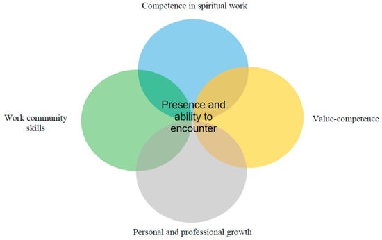 Even though the MCs work in a military environment as state officials, their basic education is in theology and religious and spiritual works one of their integral job descriptions. Therefore, we should look into the core competencies of a minister first. The ecclesiastical professions of the Finnish Church include five areas of expertise that are required regardless of what the work assignment is (Figure 1). They are the competence of spiritual work, value competence, personal and professional growth, work community skills and overall presence and ability to encounter25.