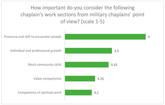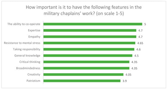 When the MCs were asked to evaluate how important it was to have certain characteristics in the MC’s work in the survey, the responses showed that the MC profession seems to have various forms of demands (Appendix B). The FDF military chaplaincy ranked in “Top 10” in the survey unanimously the ability to co-operate the highest49. In addition, the FDF military chaplaincy estimated that empathy50, expertise51, resistance to mental stress52, taking responsibility53 and general knowledge54 were important. When compared to other features, the least valuable attributes were leadership55 and obedience to authorities56, albeit all the scores were relatively high in this section.