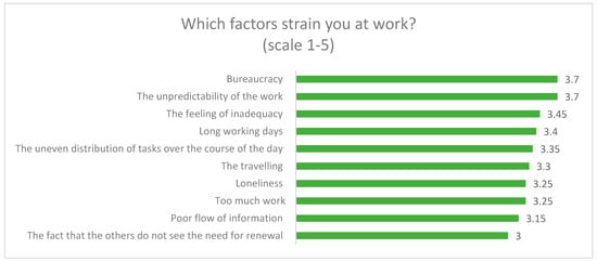 In the questionnaire the FDF military chaplaincy were asked about the factors that strain them at work (Figure 5). It seems that diverse factors bring burden to the work—there was no pattern to be identified. Of the burdening factors the ten most emphasised were the unpredictability of work90, bureaucracy91 and the feeling of inadequacy92. The less straining factors were poor work atmosphere93, personal illnesses94, the uncertain work prospects95, the lack of appreciation from the supervisor96, public appearance97, lack of appreciation by subordinates/coworkers98, the feeling that you can not influence on your job description99 and the lack of motivation100.