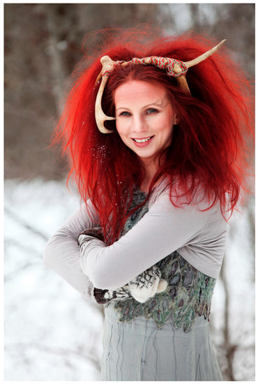 One artist at Isogaisa is Saami musician Elin Kåven (Figure 2), a Saami recording artist, who, for ten years, has aimed to bring listeners into the Arctic sphere of shamanic folklore and the mythology of Saami people. Through her music, she manifests the mythological creatures from the Arctic, and her concerts are described as fairy tales in notes. When performing at Isogaisa, Kåven, wears a pair of reindeer antlers on her head, and through dance and joik, she highlights the reindeer’s movements and qualities.2 Kåven’s choice of costume and adornment adds to a bond between power animals, ritual creativity, and shamanism. Kåven is also behind the Isogaisa festival dance. The dance was published on YouTube and on the Isogaisa homepage prior to the festival in 2011, and people are encouraged to learn the steps before arriving at the festival (https://www.youtube.com/watch?v=wXxqa_BJCOs, (accessed on 31 March 2021). Kåven describes the meaning of the dance and its connection to Saami tradition as follows: