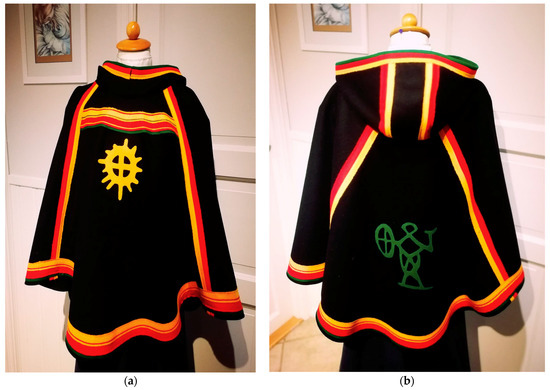 An example of this change is a luhkka (a Saami cloak with a hood) that Ebeltoft designed on commission by Saami shaman Eirik Myrhaug’s students for his 70th birthday in 2013. The luhkka is decorated with the Saami beaivi (sun) symbol on the front and a noaidi symbol on the back (Figure 3a,b). Ebeltoft’s clothes and design point to a material engagement in the production of Saami shamanism (see also Kalvig 2020), in which contested symbols with roots in the pasts are highlighted to form shamanic identities in the present.4