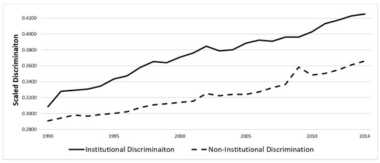 Discrimination Against Religious Minorities, 1990–2014. Significance (t-test) between institutional and non-institutional <0.001 in 1990–2014. Significance (t-test) between institutional in 1990 and institutional <0.05 in 1996–1997, <0.01 in 1998–1999, <0.001 in 2000–2014. Significance (t-test) between institutional in 1990 and institutional <0.05 in 1993, <0.01 in 1994, and <0.001 in 1995–2014.