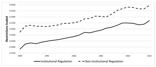 Restrictions on All Religions, 1990–2014. Significance (t-test) between institutional and non-institutional, <0.001 in 1990–2014. Significance (t-test) between institutional in 1990 and institutional <0.05 in 1991, 1994, <0.01 in 1995–1996, <0.001 in 1992, 1997–2014. Significance (t-test) between institutional in 1990 and institutional <0.05 in 2001, <0.01 in 2002, 2004–2007, <0.001 in 2003, 2008–2014.