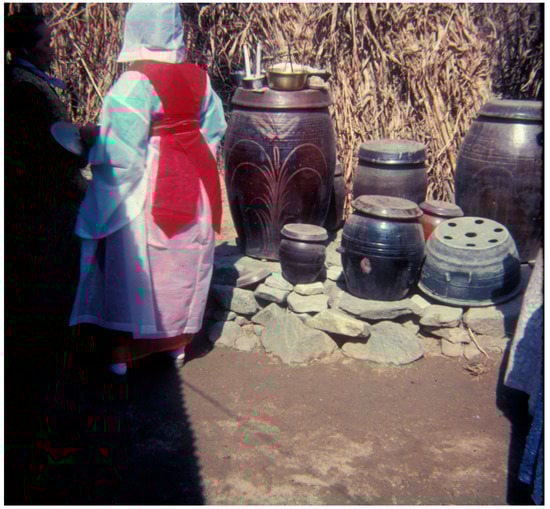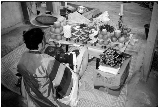 Earthen jars (tok, hangari, tanji) filled with grain as placings for different household gods, ancestors, and other family dead appear in many accounts as do small covered baskets and pouches (Akiba 1957, pp. 102–4; Clark [1932] 1961, p. 206; Guillemoz 1983, p. 119, 150, Pls. 9, 10; MCBCPP 1969–1978, “Chŏlla Namdo”, 258–59; 1971 “Chŏlla Pukto”, 94, 96; 1972 “Kyŏngsang Namdo”, 185, 186; 1974 “Kyŏngsang Pukto”, 157–163, 1975; “Ch’ungch’ŏng Namdo”, 174, 1976; “Ch’ungch’ŏng Pukto”, 103, 104; 1978 “Kyŏnggido”, 90–91). Baskets or jars holding bits of cloth or clothing for ancestors or other unquiet dead—including one mansin’s spurned suitor who had committed suicide—had, by the time of my fieldwork, been replaced by small cardboard boxes from the tailor’s shop. I encountered the “calabash” as a gourd dipper filled with rice grain and held in the hands of an infertile woman while a chanting mansin induced the Birth Grandmother (Samsin Halmŏni) into the womb-like vessel (Figure 2). The woman’s hands should shake with the agitation of the descended spirit. She would be instructed to carry the grain-filled gourd home, hoping that the Grandmother would be present and a safe birth forthcoming (MCBCPP 1971, “Chŏlla Pukto”, p. 92; Kendall 1977).