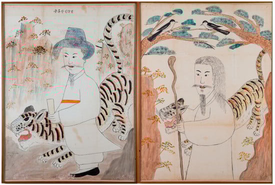 Mountain God paintings are now conventionalized images but these two old images, probably by the same hand, reveal distinctive visions of different Gods on different mountains, early- to mid-20th-century. Museum of Shamanism, photograph by Jongsung Yang.