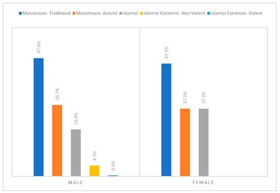 Moreover, as Figure 1 shows, the basic Islamic worldviews of our male and female cohorts were similar. The only noticeable difference came in the higher proportion of women (27%) than men (19%) that clustered into the Islamist worldview.