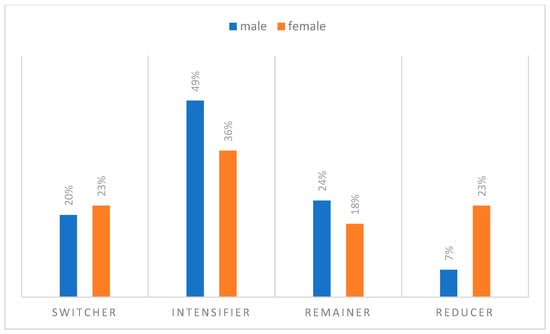 As Figure 2 shows, half of the men intensified their religiosity while a third of the women did. By contrast, 7% of the men reduced their religiosity while almost a quarter (23%) of the women did. The differences between men and women were less marked regarding switching and remaining.
