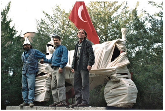 In 1990, the Kyzyl Tractor collective covered up the machine, the red tractor on the pedestal, in a performance called ‘Mummification’ (Figure 2). The gesture entailed an artistic appropriation, expressed by the group’s name of Red Tractor, reminiscent of the well-known work of contemporary artist Christo (Christo Vladimiroff Javacheff) who used to wrap landmarks in fabrics. The performance’s title suggests that by means of a symbolic plastering and bandaging of the red tractor, this model of technical progress was to be preserved for centuries.