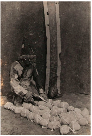 Responding to the question of the place and role of religion in modern Kazakhstan, Atabekov created the project ‘The Way to Rome’ (2007–2015). Working on this art project, he was inspired by the Great Silk Road and Marco Polo’s journey in the thirteenth century from Italy through Central Asia to China. As the title ‘The way to Rome’ suggests, Atabekov imagines the trajectory in a westward direction, reversing Marco Polo’s path. The Abrahamic religions used to be foreign to the Central Asian region where the inhabitants adhered to Tengrism. Figure 10 is Atabekov’s photograph of three iron signs with the symbols of the three monotheistic religions—Judaism, Christianity and Islam, respectively—placed in a field of poppies. The poppies in the steppe, along with the religious symbols, evoke Karl Marx’s statement that religion is ‘opium for the people’ (the crescent with handle, ironically, resembles the sickle, symbol of the peasants in the Soviet era, which might refer to the enforced collectivisation and sedentarisation). Atabekov uses the steppe (including its open sky, so important in Tengrism) as a backdrop to this work in which it serves as a reminder of the inclusiveness of the worldview of the nomads (Kudaibergenova 2019, p. 238). As mentioned, aspects of the syncretic religiosity of the Kazakhs, such as ancestor worship, have survived until today.