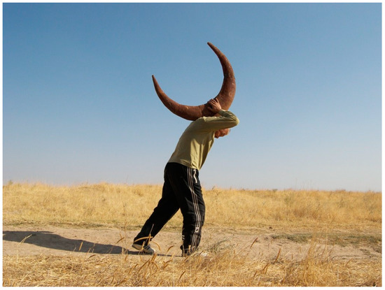 As mentioned in the Introduction, Said Atabekov and the other members of the Kyzyl Tractor art collective imagined themselves as ‘ancient shamans’. They wanted, as Atabekov put it, ‘to reconnect with the steppe’ (Kudaibergenova 2019, p. 233). This ‘steppe culture’ (Harva 1938, p. 16) was based on a nomadic way of life. Tengrism, an animistic religion named after a deity of the sky, Tengri (Harva 1938, p. 142), reflected the worldview and ethos of the nomads (cf. Orynbekov 2013, p. 24; Ayupov 2012, p. 13). The world in these understandings consisted of three layers: Upper (celestial), Middle (earth) and Lower (subterranean); shamans acted as intermediaries between them (Orynbekov 2013, pp. 25–26). Laruelle (2007, p. 204) describes Tengrism as the ‘syncretic religion practiced in the Turkic khaganate before the peoples of the region converted to Buddhism to Manichaeism, or to Islam’. Valikhanov (1987, p. 299) speaks of syncretism as well; the Kazakhs were influenced by different religions but, in actual practice, maintained adherence to Tengrism and Shamanism as well. Yemelianova (2014, p. 287) makes clear that their ‘nomadism, which did not allow for mosque-based worship, accounted for the wide diffusion among them of Sufism (mystical Islam).’ The popular form of Sufism was spread by wandering dervishes and merchants, resulting in a ‘blending of shamanism and Islam’ (Mélikoff 1996, pp. 133–34). This syncretic ‘islamised shamanism’ took hold in Kazakhstan (and exists, to a certain extent, in the present day). ‘The outer appearance of the wandering dervish’, writes Mélikoff (1996, p. 134), ‘was no different from that of the shaman’. Furthermore, they conduct similar ceremonies, ’intended to induce a trance’, in both cases ‘for healing purposes’ (ibidem). We will see in Section 3 (see also Figures 5 and 6) that Said Atabekov adopted the role of dervish shaman in some of his performative art. With the other members of Kyzyl Tractor, he also performed as a shaman (baksy).