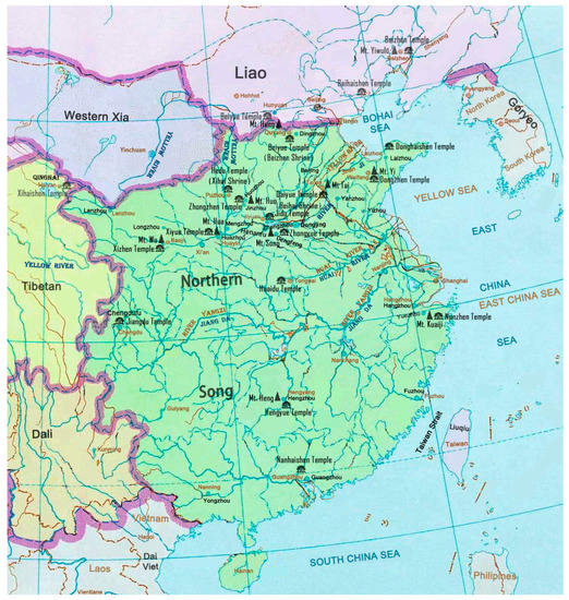 Temples of the five sacred peaks, five strongholds, four seas, and four waterways in the Northern Song (The Northern Song map is based on Tan 1982–1987, v. 6.1).