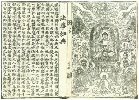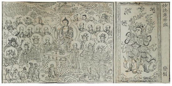 It was in this context that the Gyeonseongam edition was made as the reproduction (re-carving) of a sutra from the Ming dynasty. Then, four years later, the iconography of the Gyeonseongam edition was used in the frontispiece illustration for the Hangeul (native Korean script) edition of the Lotus Sutra published by Gangyeong Dogam 刊經都監 (Office of Sutra Publication) (1463). Later, it was also used in sutra illustrations for three subsequent editions of the Lotus Sutra commissioned by the royal court and from there spread among Buddhist temples. During the sixteenth century, prints of the same type as the Gyeonseongam edition are seen to have spread from temples such as Gwijinsa 歸眞寺 (1513) and Gwangheungsa 廣興寺 (1527), which reproduced prints produced by the court during the fifteenth century in close connection with the royal family. These prints continued to be reproduced or copied until the eighteenth century. 17