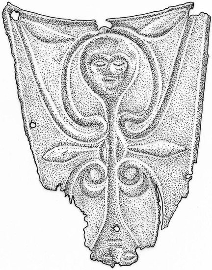 The third piece of La Tène decorated metalwork comes from a very different time and geographical location from those found at Weiskirchen and Reinheim. It comprises a broken trapezoid plaque (originally one of a pair, the second now lost) of very thin sheet bronze, once mounted on a backplate, probably a shield. It is part of a hoard of metalwork, some military (including shield bosses and horse harnesses), found at Tal-y-Llyn, Merionethshire (North Wales), which includes both insular La Tène and Romano-British material. The cache includes objects of varying dates and is generally accepted as a metalworker’s collection of scrap to be melted down and recast.