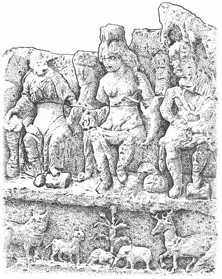 In a previous publication (Aldhouse-Green 2004, pp. 205–6), I highlighted a curious and complex piece of Gallo-Roman religious sculpture from the town at Bolards (Nuits-Saint-Georges) in Burgundy. Significantly, this settlement and its sanctuary were deliberately founded at the intersecting frontiers of three powerful eastern Gaulish tribes: the Sequani, Lingones and Aedui. The great temple was situated on the site of thermal springs and it was clearly a place of pilgrimage for the sick. There is evidence for its significance before the imposing stone building was constructed in the first century AD (Planson and Pommeret 1986, pp. 26–31). Investigation of the southern part of the religious precinct revealed what may have been the focal image; it has been dated to the second century AD. The stone relief carving (Figure 8) is divided into an upper and lower register. On the lower is a frieze depicting five animals centred upon a tree at the midline. The outermost creatures are a bull and a stag; in front of the bull is a dog, and before the stag is a wild boar, while in the middle, facing the boar, is a hare (both the boar and hare are apparently grazing beneath the tree). So, presented here is a deliberate amalgam of wild nature and domestication, separated by the tree, which, perhaps, represents the conduit or portal between the two states of being. On a jutting shelf above the animal frieze sit three much larger, anthropomorphic figures. On the viewer’s left is a woman dressed in a long flowing robe, with a cornucopiae and a basket brimming with food, above which she holds a patera; the central figure depicts a long-haired, semi-clad person with female breasts and male genitals, wearing a mural crown that may signify guardianship of the town and its temple; the third image is that of a bearded male. He is triple-faced, gazing front and to each side, and on his head are antlers. His emblem is a sack of bread (Deyts 2001, pp. 129–42; Pommeret 2001, no. 82, figs. 8 & 9).